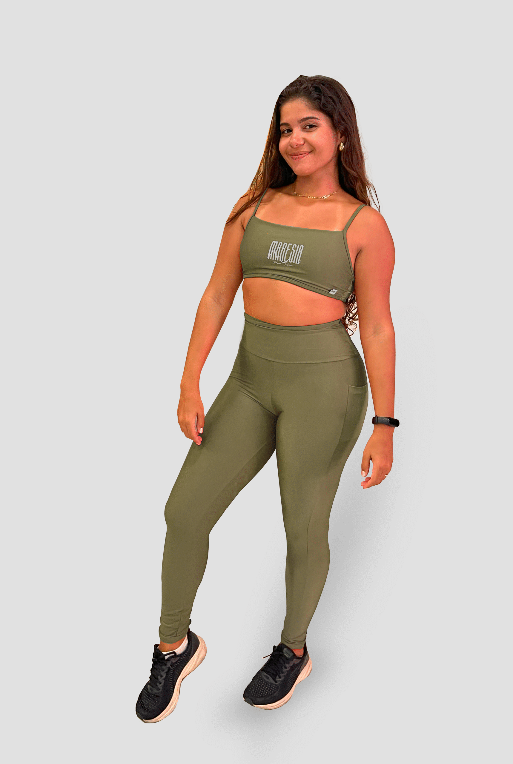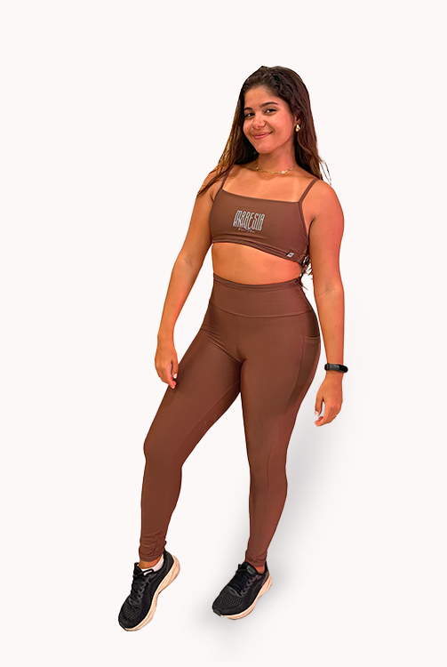 Composto por top de alças finas com decote reto e legging de cintura alta que modela e valoriza a silhueta, ele oferece sustentação, compressão na medida certa e liberdade total de movimento.